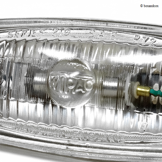 エッジの効いたデザインのガラスレンズ中央には「WIPAC」のマーク、上部に「SERIES 210 SAE. R72」